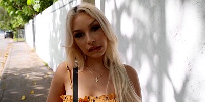 Blonde in a yellow dress Carmen Caliente gives a professional blowjob